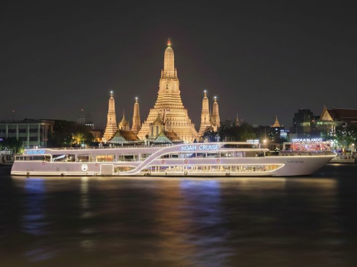 เริ่มล่องเรือดินเนอร์สุดประทับใจบนแม่น้ำเจ้าพระยา เพลิดเพลินกับบุฟเฟ่ต์นานาชาติ ดนตรีสด และการแสดงรำไทยท่ามกลางวิวค่ำคืนอันสวยงาม |