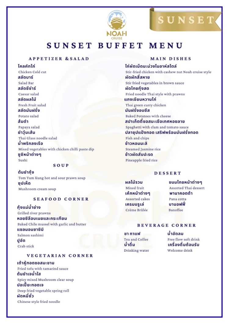 เริ่มล่องเรือดินเนอร์สุดประทับใจบนแม่น้ำเจ้าพระยา เพลิดเพลินกับบุฟเฟ่ต์นานาชาติ และการแสดงดนตรีสด ท่ามกลางบรรยากาศยามพระยาทิตย์ตกไปจนถึงพลบค่ำ